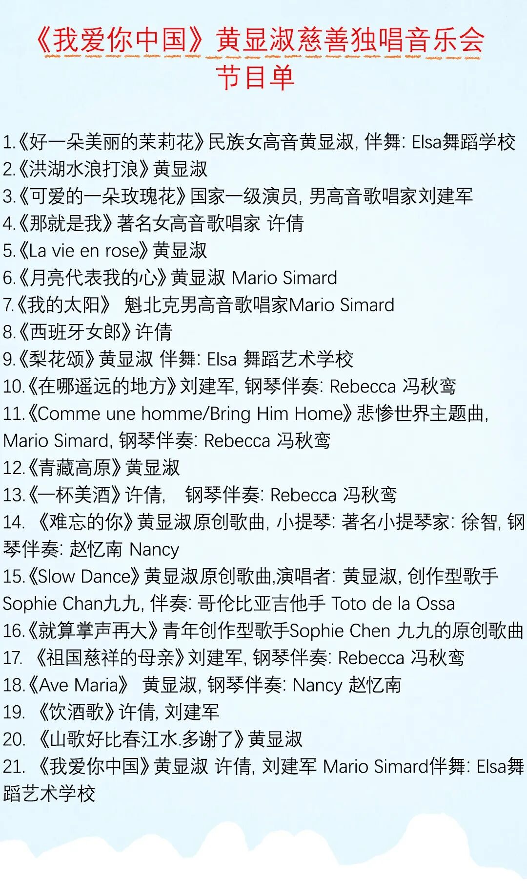 黄显淑慈善独唱音乐会阵容鼎盛,群星荟萃,精英云集,中加艺术翘楚同台献艺。本场慈善音乐会由驰名歌坛的华人民族女高音黄显淑女士倾力发起并领衔主演。特邀中国国家一级演员、著名歌唱家等多位国家级艺术家联袂登台,更有青年创作型歌手以新锐之声共襄盛举,融汇经典与现代,展现多元艺术风采。同时中外乐坛名家执键拉弦、抚琴弄韵,以精湛技艺构筑音乐会声景之基。ELSA舞蹈艺术学校舞蹈团将以曼妙翩跹的舞姿为音乐会增韵添彩。