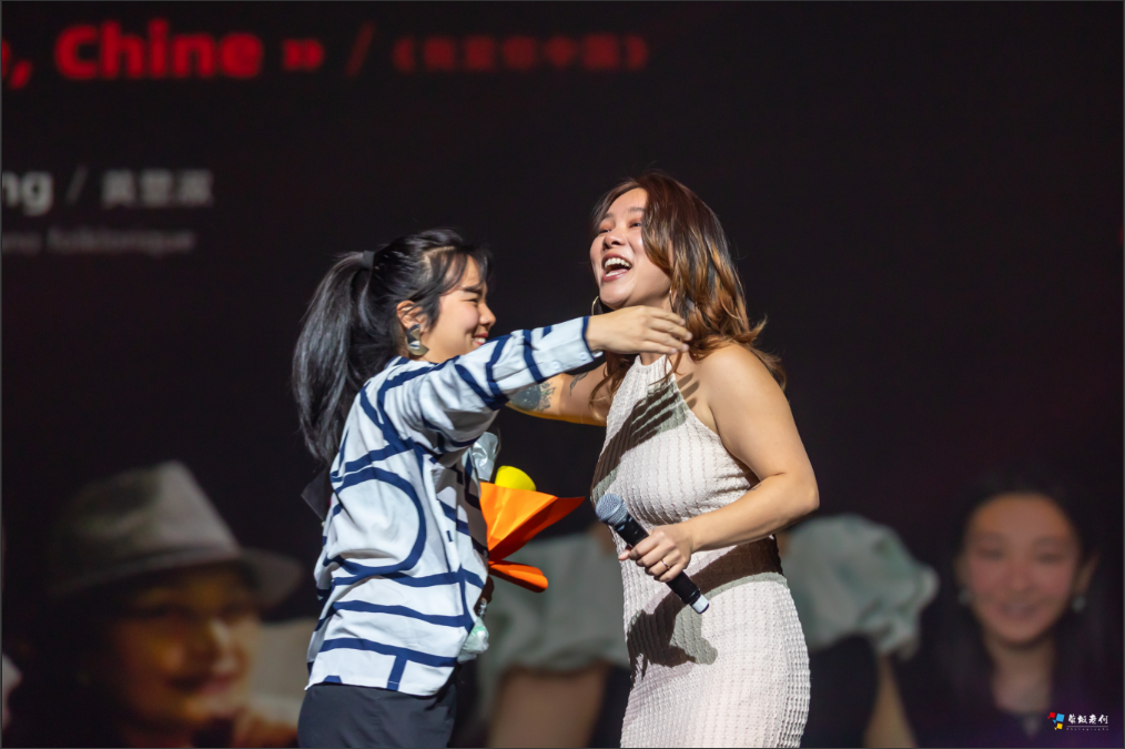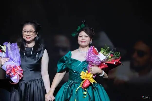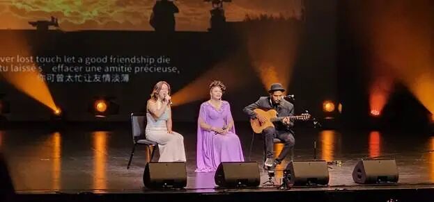 英文原创歌曲《Slow Dance》则展现了显淑音乐表达的另一面——从容与现代的融合。她与创作型青年歌手Sophie Chen(九九)携手,伴随哥伦比亚吉他手Toto de la Ossa细腻的拨弦,节奏温柔而律动,仿佛一场缓缓流动的心灵之舞。显淑与九九以温婉的嗓音诠释了含蓄内敛的温柔感动,是一首清丽婉转的情怀之作。观众席中,有人轻轻随旋律摇动,也有人闭目细听,在这首歌的柔光中,重新感受生命中那些被忽略的温暖瞬间。这首歌曲是黄显淑女士由衷想向观众传递的信息,希望大家慢享生活,珍惜身边的亲人和朋友。九九的青春与激情在舞台上绽放,与显淑的沉稳优雅相映成趣,她们的完美合作彰显了两代海外音乐人的文化传承与情感交融。