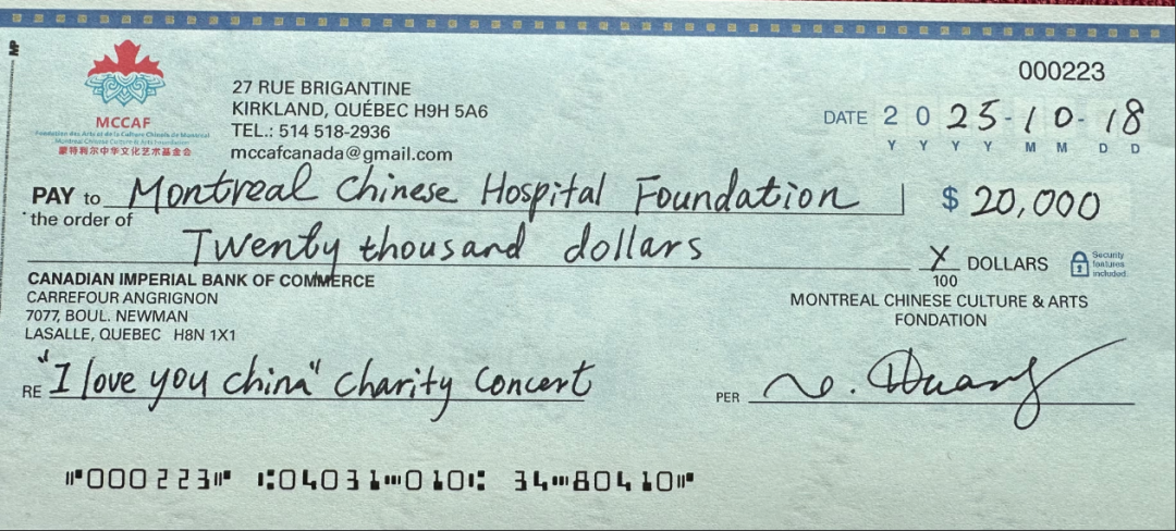 黄显淑捐给蒙特利尔中华医院$20000 加币的支票