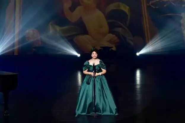 《Ave Maria》是一首意大利语经典圣咏,这首经典歌曲对艺术家的音色有着极高的要求,一袭绿色丝绸欧洲华服的显淑站在聚光灯下,随着钢琴伴奏赵忆南手中的弹奏,她空灵的唱腔与质朴音色回响在音乐厅上空,圣洁而庄严,舞台上仿佛闪烁着晨曦之光,令观众肃然起敬,沉浸在音乐带来的神圣氛围中。