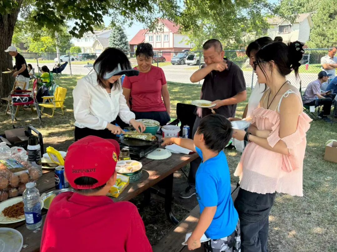 最让人惊喜的,是若绮现场支起铁板,为大家摊煎饼果子。在蒙特利尔的湖畔草地上,看见熟悉的铁板、旋转的手势,仿佛一下子回到了天津的街头、南开的校门口。面糊摊开成一层薄饼,鸡蛋铺上,酱料均匀刷开,再撒葱花,放果篦儿,手腕一翻,一卷,一份热气腾腾的煎饼果子就完成了。香气随风飘散,吸引了大家围拢过来。有人笑着说:“就是这个味儿!”有人举起手机拍下这珍贵的一幕。咬下一口,外香里脆,熟悉的滋味让人心头一暖。身在海外,却能在湖边草地上吃到煎饼果子,那份亲切与温情,是漂泊的人最容易被触动的柔软。