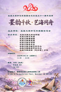 Home协会活动十一年墨韵飘香,邀您共赴一场艺海之约 协会活动 十一年墨韵飘香,邀您共赴一场艺海之约 By Guo Jun March 17, 2026 0 36 Share FacebookXPinterestWhatsApp 十一年墨韵飘香,邀您共赴一场艺海之约 ——「墨韵千秋 · 艺海同舟」北美文联诗文音乐会即将启幕 十一载春秋,以文会友; 十一载耕耘,以艺传情。 自成立以来,北美文学和艺术家联合总会始终扎根海外,以文学为根、艺术为桥,汇聚华文创作力量,传承中华文化薪火。2026年3月21日,值此北美文联成立十一周年之际,我们诚挚邀请您莅临 「墨韵千秋 · 艺海同舟」北美文联诗文音乐会,与我们一同回首来时路,共话新篇章。 🌸 墨韵千秋 · 艺海同舟 本次活动汇聚诗文、音乐、朗诵、舞蹈、书画、汉服展示等多元艺术形式,呈现一场兼具文化深度与艺术温度的人文盛宴。三十余个精彩节目轮番登场,经典与原创交织,传统与现代共鸣: 声乐篇章——从民歌对唱《大地飞歌》到女声独唱《故乡是北京》,从《高原蓝》到《兰花花》,南北歌韵,声声入心;法语歌曲《Maison》《Pour que tu m’aimes encore》更添国际风采。 诗文朗诵——蒙村老郭原创《枫花雪乐纪》、婉冰《峡湾中的极光》、吕孟申《游子吟》,以及史铁生、余华、莫言、鲁迅等名家金句联诵,最终以朱自清《春》的童声合诵收尾,文字之美,声声不息。 器乐舞蹈——马头琴《草原的呼唤》奏响草原辽阔,电吹管演绎《肖斯塔科维奇第二圆舞曲》别具一格;汉服秀《丽人行》、新疆舞《雅丽古娜》、现代舞《等你在美丽的松山湖》等,舞步翩跹,华彩纷呈。 特别呈现——书画表演《花鸟写意》与马潜书画作品展,墨韵飘香,丹青寄意;大合唱《汉阳门花园》由湖北同乡会与北美文联联袂献唱,共叙乡情。 📅 活动信息 时间:2026年3月21日(星期六)11:30 – 16:00 地点:蒙特利尔唐人街畔溪酒家二楼 (67 Rue De La Gauchetière Ouest, Montréal, QC H2Z 1C2) 主持人:邵慕馨、张琦雯、戴环宇、范璧成 🎫 参与方式 北美文联在册会员:免餐费(需缴纳新年度会费30加元) 非会员:餐费25加元/人 VIP嘉宾:30加元/人 会费及餐费可通过 e-transfer 缴纳至:[email protected] 📞 联系我们 如需咨询、报名或洽谈合作,请联系: 李慧敏(秘书长):514-699-3629 更多信息敬请关注北美文联官方网站:https://nalitarts.com 以诗为帆,以乐为舟。 墨韵千秋,艺海同舟。 三十余个节目,十一载深情。 2026年3月21日,诚邀您亲临现场, 与我们一同见证艺海航迹, 聆听诗文回响,共启下一程诗意远航。 节目单 媒体广告 Share FacebookXPinterestWhatsApp Previous article原创歌曲《再青春》 Guo Jun RELATED ARTICLES 协会活动 原创歌曲《再青春》 March 17, 2026 协会活动 万里风涛起,神州步更坚——读“十五五”规划有感 March 14, 2026 协会活动 【六月声场·时空交响】第三届”明天会更好”慈善音乐会 March 8, 2026 Most Popular 原创歌曲《再青春》 March 17, 2026 万里风涛起,神州步更坚——读“十五五”规划有感 March 14, 2026 【六月声场·时空交响】第三届”明天会更好”慈善音乐会 March 8, 2026 灯映蒙城月 文润海外春 March 3, 2026 江汉春风连万里 蒙城乡情暖千家 March 1, 2026 舞剧《化蝶归来》| Dance Drama The Return of the Butterflies February 26, 2026 以文化为桥 以乡情为根 February 26, 2026 春夜燃灯处 少年踏歌行 ——2026满地可华人联合总会春节晚会暨第八届优秀学生奖学金颁奖典礼侧记 February 26, 2026 【电影信息】||《蒙特利尔,我的美人》(现在正在加拿大多个城市上映)—— 在异乡与心灵之间,寻找一座城的温度 February 19, 2026 在光影之上,我愿为春天守灯 February 14, 2026 Load more